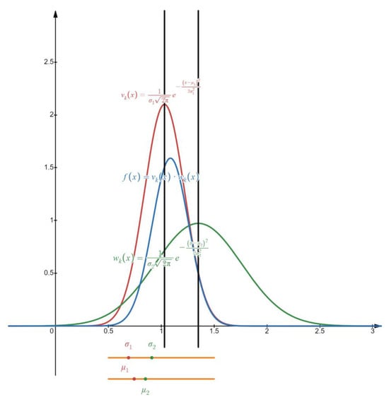 Figure 4 shows the image description of the above process. It is obvious that the red and green curves are two independent Gaussian distributions. From the blue curve, it can be roughly seen that the product result is a compressed Gaussian distribution with an expected value between [, ], and the variance and the mean properties of the new Gaussian distribution remain unchanged. Finally, after fusing two different Gaussian distributions, the result is still conforming to the Gaussian distribution.