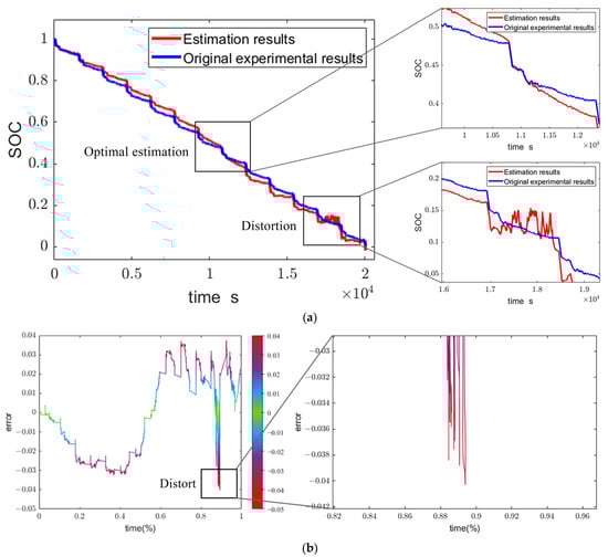 By incorporating the results of offline parameter identification into the initial state of online parameter identification, we can simulate the charging and discharging states of the battery in this way and obtain the following simulation results graph. Figure 5a shows the original experimental results and estimation results. The blue curve represents the original experimental results, and the red curve represents the estimation results. Figure 5b shows the estimation error.