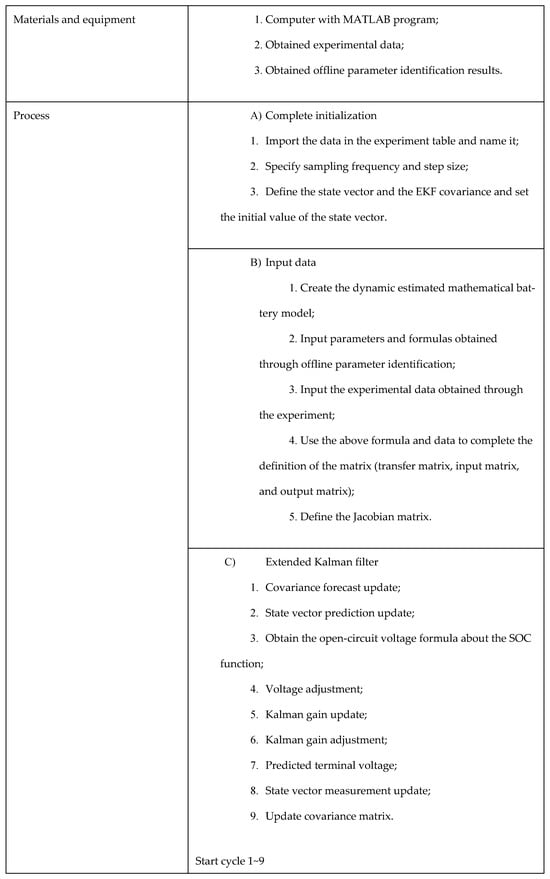 The overall experimental process can be divided into the following steps: (1) Determining the physical model of the battery corresponding to the experiment: this step is crucial, as it will directly affect the number of parameters and results in the subsequent parameter identification; (2) offline parameter identification: it is mainly carried out by centrally processing the data to obtain the estimated model parameters and then inputting them into the online parameter identification algorithm. The relationship between SOC and OCV is identified during the estimation of battery capacity in real-time; (3) online parameter identification: the principle of online parameter identification is to use the recursive real-time updating of model parameters during system operation using EKF; (4) this step compares the estimated data with the original data and analyzes the robustness, convergence, and accuracy of EKF in the production estimation process.
