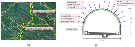 The Dabashan Tunnel is a crucial component of the Yinbai Expressway, connecting Chengkou County (located in Chongqing) to Langao County (located in Shaanxi Province), as shown in Figure 1a. The tunnel spans approximately 13,755 m, crossing both Shaanxi Province (8380 m) and Chongqing Municipality (5355 m). It is classified as a super-long tunnel project, characterized by large excavation volumes and stringent safety requirements. The main tunnel structure is designed as a separated twin-tube tunnel with a net height of 8.53 m and a net width of 12.5 m. The schematic design of the tunnel cross-section structure is shown in Figure 1b.