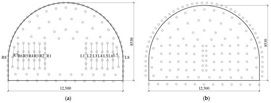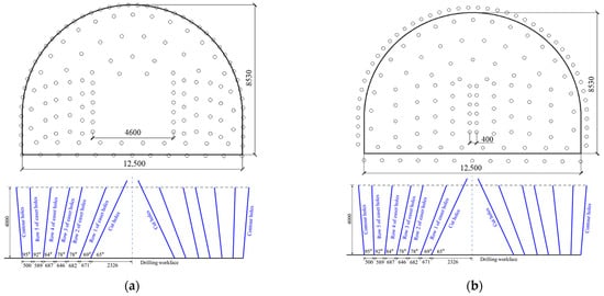 The Dabashan Tunnel adopts a full-face blasting excavation method with a wedge-shaped cut type. The drilling is performed using a three-arm rock drilling jumbo, which is program-controlled for hole spacing and angle, allowing precise drilling according to blasting design parameters, providing foundational conditions for this study. A typical hole layout for conventional blasting is shown in Figure 2. Figure 2a shows the blasting design of the hole top locations. Otherwise, Figure 2b illustrates the positions of the hole bottoms. These positions were obtained by the intelligent drilling jumbo. The design includes a total of 147 blast holes, among which there are 12 cut holes, arranged in one row on each side, with the blast holes angled at 65° to the drilling face. There are 78 easer holes, arranged in 4 rows in the arch section, 5 rows on each side in the lower section, and 1 row at the bottom. There are 57 contour holes, including 14 floor holes.