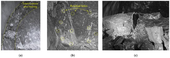 Photographs of on-site effects after blasting. (a) Uneven contour, no half-hole marks; (b) large number of residual holes and the need for a second blast to break up the rock; (c) a lot of large-size rocks in the blasting muckpile, which affects the efficiency of crushed rock transportation.