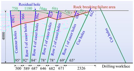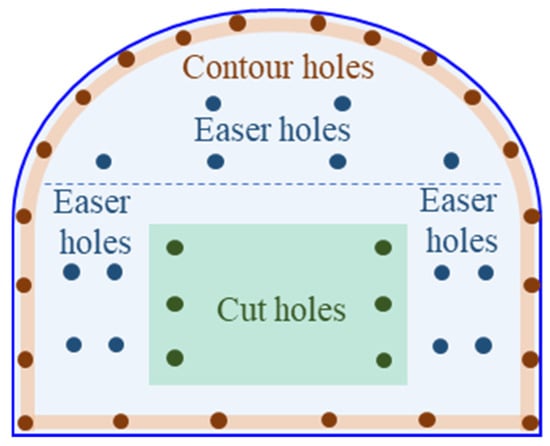 In tunnel blasting, blast holes can be classified into three categories based on their functions: cut holes, easer holes, and contour holes. As shown in Figure 5, cut holes are used to create a new free surface, providing favorable conditions for rock breaking by the easer holes [18]. Contour holes are used to control the quality of the tunnel profile [19,20], with both types having clear roles and specific functions, resulting in relatively smaller rock-breaking burdens. Their design theories and methods are relatively mature. In contrast, easer holes serve as the main force in blasting excavation, especially in the lower part of the tunnel adjacent to the cut blasting area, taking on most of the rock-breaking tasks. The design of the easer hole positions is directly related to the excavation advance, the flatness of the working face, and the degree of rock fragmentation. Therefore, this paper focuses on the planning methods for the positions of easer holes in the lower part of the tunnel adjacent to the cut blasting area and the relationship between hole position parameters and blasting effects.