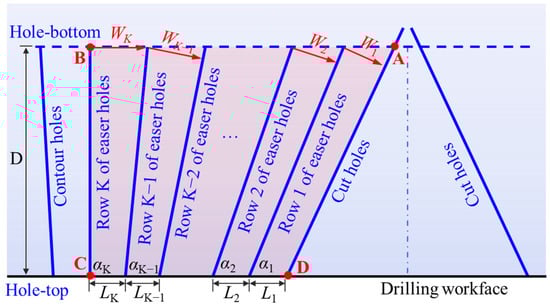 In this method, the known parameters include the excavation width, advance per round, and the geometric parameters of the cut holes and contour holes. As shown in Figure 6, the goal is to solve for the blast hole layout within the red trapezoidal area, which includes the geometric parameters of the easer holes. Since the determination of the spacing of contour holes has certain complexities, the position of row K of easer holes is pre-determined to simplify the calculation process.