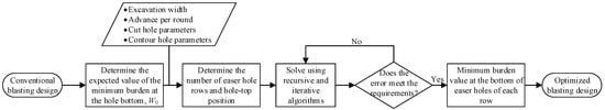 The burden of blast holes is a critical factor that determines the rock-breaking effect. The optimization process for blasting design based on the minimum burden principle of easer holes is shown in Figure 7. Firstly, the expected value of the minimum burden at the hole bottom is determined based on engineering experience. Then, based on the known positions of the cut holes and contour holes, the number of rows of easer holes and the positions of the hole tops are determined. A recursive and iterative algorithm is used to solve for the minimum burden values at the hole bottom of each row that meet the prescribed relationships. Finally, the hole bottom positions of each row of easer holes are determined, resulting in a complete optimized hole layout scheme.