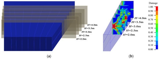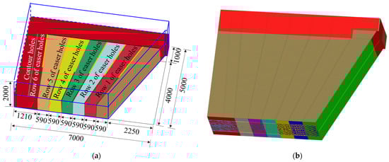 The blasting model is shown in Figure 8. As shown in Figure 8a, the overall model dimensions are 7000 mm in length, 2000 mm in height, and 5000 mm in width. The blast hole diameter is 42 mm, and the charge ratio is 0.6. The vertical depth of the easer holes and contour holes is 4000 mm, with an over depth of 200 mm for the cut holes. Before the model is imported into LS-DYNA R11.1 software for computation, it is assumed that the cut holes have already been blasted, forming a complete cavity and a second free surface.