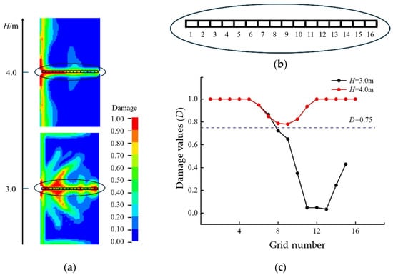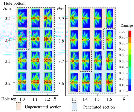 Although post-processing software LS-PREPOST v4.3 can visualize the damage changes and damage propagation during the blasting process, it cannot directly measure the length of residual holes after blasting. To address this, the SECTION function in the MODEL card of the software can be used to slice the blasted rock mass and obtain cross-sectional views at different positions, as shown in Figure 10a. The cross-sectional views are parallel to the drilling workface, with an interval of 0.5 m between adjacent sections. The depth H values of the cross-sectional views from the hole top are successively 2.0 m, 2.5 m, 3.0 m, 3.5 m, and 4.0 m.