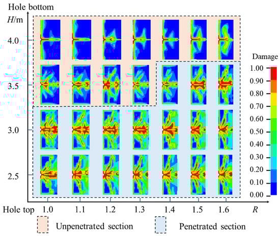 After the seven models were solved and computed, damage contour maps of the rock mass were obtained, as shown in Figure 9. Since fracturing is the main form of action that explosives have on the nearby rock mass, and the rock mass damage variable can represent the fracturing state of the rock mass, the damage extent of the rock mass in different models was analyzed to select the optimal drilling scheme. Based on the analysis results and comprehensive research objectives, this study evaluates the blasting effects using two indicators: the level of residual holes at the bottom and the uniformity of the damage volume.