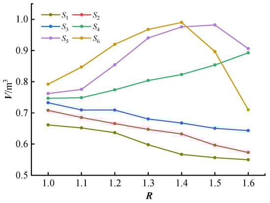 The statistical results of the damage volumes of the rock mass burdened by each row of easer holes under different conditions are shown in Figure 15. The horizontal axis represents the control ratio R for different schemes, while the vertical axis represents the damage volume V of the rock mass burdened by each hole, with S1 to S6 representing the first to sixth rows of easer holes in each scheme.