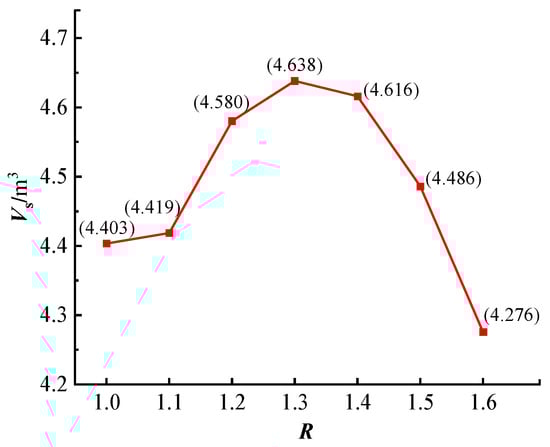 Figure 16 shows the relationship between the total damage volume vs of the rock mass and the control ratio R for different models. The horizontal axis represents the control ratio R for each scheme, while the vertical axis represents the total damage volume vs for each condition, with specific values of total rock damage volume indicated in parentheses for each model. It can be seen from Figure 17 that as R increases, the total damage volume vs gradually increases, reaching its maximum value of 4.638 m3 at R = 1.3. Beyond this point, the total damage volume vs begins to decrease, reaching its minimum value of 4.276 m3 at R = 1.6. Therefore, from the perspective of total damage volume, the optimal blasting effect is achieved when R = 1.3. However, since the total damage volumes for R = 1.2 and R = 1.4 are similar to that for R = 1.3, with differences within 2%, these two conditions can also be considered as alternative solutions.