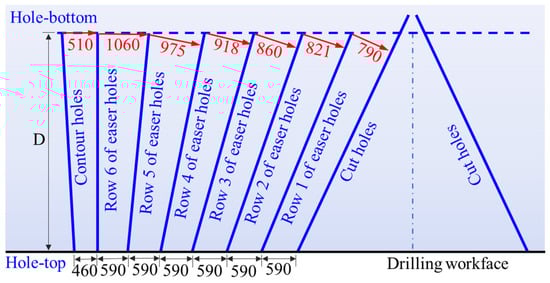 To verify the effectiveness of the optimized blasting scheme and the feasibility of the easer hole design method based on proportionally setting the minimum burden, the new scheme was applied to the Dabashan Tunnel for field testing. Based on the numerical simulation results, new easer hole positions were designed according to the optimal proportionality ratio, as shown in Figure 18. In the new easer hole design, the spacing between the hole tops is equal, and the minimum burden of the hole bottom is set according to a ratio of R = 1.3. The overall optimized hole layout is shown in Figure 19.