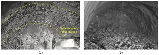 Drilling and blasting methods are the most popular methods for tunnel excavations due to their low cost, high efficiency, and easy operation [1,2]. In tunnel blasting, the minimum burden, which is the shortest distance between the explosive charge in the hole and the nearest free surface, is a critical factor determining the effectiveness of the blast [3,4]. It is also a key parameter in the design of hole layouts. For the commonly used wedge-cut blasting technique in tunnels, the minimum burden of the explosive is determined by the spacing between the holes at the hole tops and the angle between the hole and the working face [5,6,7]. The proper calculation and adjustment of these parameters are essential to achieve effective rock breakage and ensure optimal blasting results.