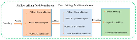 When the shallow drilling fluid is configured, 4% KY-1 (shale inhibitor) + 3.5% KJ-2 (fluid loss agent) + 0.25% KZ-1 (Tackifier) + 1.2% KN-1 (viscosity reducer) was added to the shallow drilling fluid formulation to make a deep drilling fluid. The full experimental flow of this paper is shown in Figure 1.