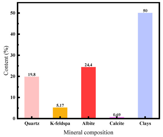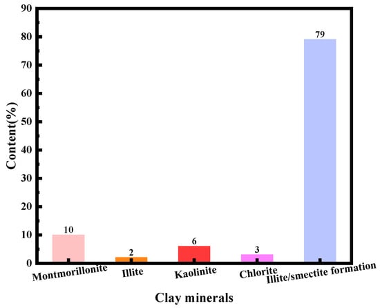 According to the “X-ray Diffraction Analysis Methods for Clay Minerals and Common Non-Clay Minerals in Sedimentary Rocks” (SY/T5163-2010), the mineral composition and clay content of rocks from the Sand III and Sand IV horizons were analyzed semi-quantitatively and quantitatively using a D/max 2500 X-ray diffractometer. The results are shown in Figure 2 and Figure 3. As illustrated in Figure 2 and Figure 3, the core samples are predominantly composed of clay, accounting for up to 50.00%. This is followed by sodium feldspar and quartz, constituting 24.37% and 19.77%, respectively, with minor amounts of potassium feldspar and calcite. The clay composition within the shale mainly consists of mixed layers of illite and montmorillonite, with some development of montmorillonite. Illite accounts for about 2%, and other clay minerals are present in smaller amounts. This indicates that these rocks have a strong hydration and swelling capacity, making it easy for drilling fluids to penetrate cracks upon contact with water-based drilling fluids, thereby increasing the stress intensity at the fracture tips. Microfractures gradually extend under high stress and external forces, reducing the effective stress around the wellbore. This further expansion of microfractures leads to wellbore instability [22].