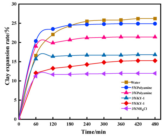 To address the issue of the mudstone in the shallow section easily forming slurry and to emphasize the strong inhibitory properties of anti-collapse drilling fluid, various inhibitory salts were evaluated for their inhibitory effects using a clay swelling experiment after the shallow core was pressed and sliced [24,25]. The experimental results are presented in Figure 5. As shown in Figure 5, the order of inhibitory effectiveness of the three inhibitors is NH4Cl > KY-1 > Polyamine. However, due to the instability of NH4Cl at high temperatures, which can easily decompose and produce irritating odor gases, KS-1, a high-temperature-resistant salt developed in the laboratory, is more suitable for this drilling fluid system. Consequently, KY-1 was selected as the inhibiting salt [26,27].