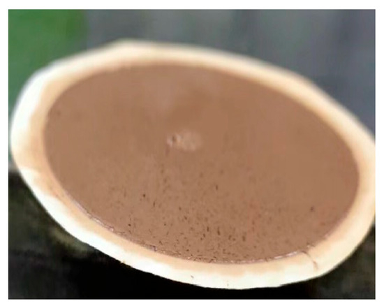 As shown in Table 5, the viscosity of the new anti-collapse drilling fluid did not change much after hot rolling at 140 °C, and the filtration vector was reduced from 4.1 mL to 3.0 mL, which indicates that the configured new slurry has a better filtration loss and wall-making, and its rheology and rock-carrying capacity are in line with the construction requirements. Meanwhile, from the high temperature and high pressure water loss of 9.5 mL and the mud cake diagram (Figure 6), it can be seen that the mud cake is thin and dense, indicating that the addition of an anti-temperature and filtration loss reducer effectively plugs the tiny pores in the drilling fluid, and it can reduce the infiltration of filtrate into the formation to meet the needs of the site.