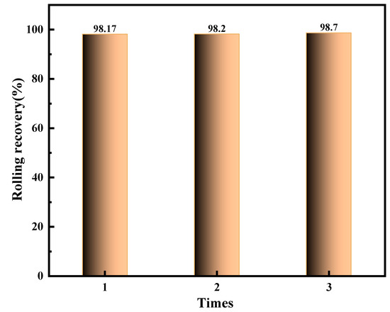 High-temperature inhibition can respond to the guarantee that the drilling fluid can function properly in deep-well operations [40]. The transformed deep drilling fluids were measured using the experimental method in Section 2.3.2. The 140 °C core rolling recoveries of the new anti-collapse drilling fluid are presented in Figure 7. As shown in Figure 7, the drilling fluid exhibits excellent inhibition, with hot rolling recoveries exceeding 98%. This indicates that the converted drilling fluid maintains strong inhibition under simulated high-temperature (140 °C) conditions. It indicates that the anti-temperature inhibitor in the transformed anti-temperature anti-collapse water-based drilling fluid can inhibit the dispersion of mud shale hydration for a longer period of time, suggesting that it has excellent shale hydration inhibition properties.