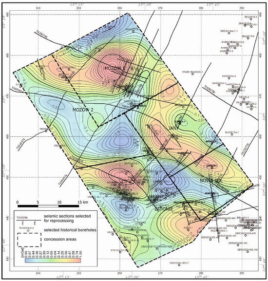 Historical seismic reflection materials were reprocessed by means of the ERC method (effective reflection coefficients) for the Mozów-1, Mozów-2, Jany, Wilcze, Nowa Sól, Borzęcin, Janowo, Sulmierzyce, and Kalisz concessions. In those areas, the depth of the mineralized horizon did not exceed 2400 m, a depth accepted by the investor’s criteria for possible extraction using present day technologies. The choice of seismic sections was based on a map of prognostic Cu-Ag areas in the Zechstein [15]. The ERC method allows for a significant increase in the resolution of seismic records in comparison with the historical/current seismic imaging methods with respect to Zechstein formations. The seismic route of waves is presented using the ERC method in time-based and depth-based versions.