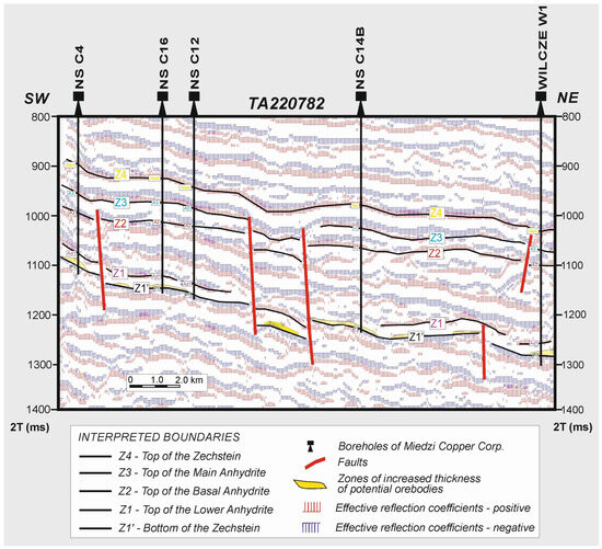 The drilling results indicated that the rocks hosting the orebodies are up to several meters thick, and their physical parameters (velocity, density, and porosity) are similar to the overburden, which consists of limestones/dolomites, anhydrites, and rock salts. Therefore, lithological changes in the bottom Zechstein sediments directly above the Z1 interface (top of the Lower Anhydrite) and the low recorded values of reflection coefficients have been interpreted as “anomalous strata” indicating potential mineralized zones. This inference has been confirmed by the drilling results from the newly discovered Nowa Sól, Mozów, and Sulmierzyce North deposits. All 20 positive boreholes in Nowa Sól were located along or near the interpreted seismic sections, confirming a success rate of the ERC method of approximately 85%.