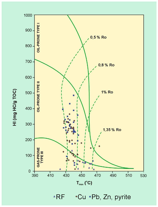 Initially, Rock-Eval pyrolysis was used in regard to the Kupferschiefer on a smaller, local scale [41,42]. In the present exploration project, this instrument was used on a larger regional scale to determine the regional relationships between the spatial distribution of Cu-Ag and Au-Pt-Pd minerals. In the Mid-Polish Trough, where the organic matter lithology of the Kupferschiefer is dominated by pyrite, ferrous, or Zn-Pb shales, Rock-Eval’s HI, OI, and Tmax (432–475 °C) indices as well as vitrinite reflectance (1.22–2.73) clearly correlate with the increasing depth. In contrast, Rock-Eval’s indices in the Sudetic Foreland correspond with the metal distribution pattern and transition zones between oxidized and reduced sediments. The lowest HI values are observed in Rote Fäule areas (with an average of 88 in oxidized shales), growing up to 242 mg HC/g TOC in the copper-rich horizon, and up to 285 mg HC/g TOC in the uppermost part of the mineralized horizon. The OI parameter ranges from 183 within oxidized shales through 34 in Cu shales to 19 mg CO2/g TOC in Pb-Zn rich parts of the mineralized interval. This pattern observed in majority of vertical sections indicates an upward-advancing alteration front, and it cannot be explained by variable redox conditions of the depositional environment.