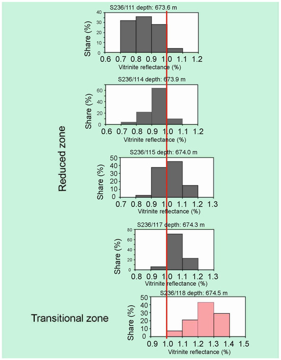 Other indicators of high-grade mineralization include the composition of organic matter, as shown by the ratio of primary coal macerals to secondary ones, and the high share of aromatic hydrocarbons within soluble organic matter [6,8]. A general correlation exists between the sample collection depth and random vitrinite reflectance, except for samples with signs of pronounced oxidation. Macerals of the vitrinite and liptinite group in shales containing ore mineralization reveal patchy textures, rims, and smear films along grain edges, with differences in the refractive index and color. These textures are probably generated after vitrinitization; their reflectograms have bimodal reflectivity patterns corresponding to a variable degree of oxidation [6] (Figure 5).