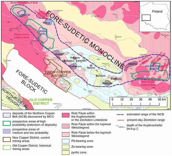 The occurrence of copper ore mineralization in the Fore-Sudetic Monocline, north and north-west of the New Copper District (the Sieroszowice-Lubin area), has been known since the oil and gas industry drilled the Wschowa 1 borehole, with low-grade copper mineralization recorded at a depth of 1933 m [1]. In the 1970s and 1980s, the Fore-Sudetic Monocline was extensively explored by oil and gas drilling, with multiple holes indicating copper mineralization. However, due to the depths which mostly exceeded 1500 m, not too much attention was paid to those findings at the time. Parallel to the documentation of several deposits in the New Copper District (NCD), researchers from the Polish Geological Institute–National Research Institute conducted limited drilling operations in other prospective copper areas of Poland, supported by systematic examination of the limited number of oil and gas wells. This enabled the preparation of several maps with more precise presentation of oxidized and reduced facies in the Kupferschiefer horizon, with suggested assessment of copper resource prospects [2,3]. Large-scale metal zonation indicated that prospects adjacent to the boundaries of oxidized/reduced areas present the highest copper potential [4]. Several of those prospects were situated far away from, and also deeper than, the deposits of the New District (mines operated by the KGHM company, Lubin, Poland).