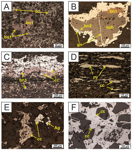 Reflected light photomicrographs of samples from the Nowa Sól deposit: (A) bornite–chalcocite semi-massive mineralization in the top of the mineralized Zechstein limestone of the Cu-bearing zone (the NS C33 borehole); (B) a sphalerite–bornite–galena aggregate in the mineralized Zechstein limestone of the Pb-Zn-bearing zone (the NS C15 borehole); (C) bornite and chalcocite massive mineralization in the copper-bearing shale of the Cu-bearing zone (the NS C30 borehole); (D) chalcocite nests and elongated lenses with µm-scale pyrite in the Cu-bearing zone (the NS C15 borehole); (E) chalcocite accompanied by native Ag filling spaces between quartz grains in the mineralized white sandstone in the Cu-bearing zone (the NS C30 borehole); (F) massive chalcocite mineralization in the top of the white sandstone; note chalcocite pervasively replacing K-feldspar grains in the Cu-bearing zone (the NS C29 borehole). Abbreviations: Ag—native silver, bn1—bornite (orange), bn2—bornite (purple), cc—chalcocite, dg—digenite, cp—chalcopyrite, gn—galena, py—pyrite, and sph—sphalerite.