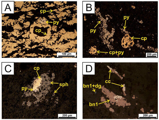 Reflected light photomicrographs of the samples from the Sulmierzyce North deposit: (A) massive chalcopyrite mineralization in the copper-bearing shale in the Cu-bearing zone (the SUL C20 borehole); (B) aggregates of framboidal pyrite cemented with chalcopyrite and chalcopyrite replacing foraminifera in the copper-bearing shale in the Cu-bearing zone (the SUL C22 borehole); (C) a sphalerite–pyrite–chalcopyrite aggregate in the copper-bearing shale in the Cu-Zn-Pb-bearing zone (the SUL C22 borehole); (D) bornite–chalcocite lenses and aggregates in the copper-bearing (marly) shale in the Cu-bearing zone (the SUL C22 borehole). Abbreviations: bn1—bornite (orange), cc—chalcocite, dg—digenite, cp—chalcopyrite, py—pyrite, and sph—sphalerite.
