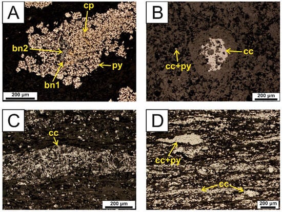 Reflected light photomicrographs of the samples from the Mozów deposit: (A) a pyrite–bornite–chalcopyrite aggregate in the Zechstein limestone in the Cu-Zn-Pb-bearing zone (the MOZ C1 borehole); (B) chalcocite filling the central part of an oncolite in the Zechstein limestone in the Cu-bearing zone (the MOZ C1 borehole); (C) chalcocite pseudo-veinlets perpendicular to shale lamination in the copper-bearing shale in the Cu-bearing zone (the MOZ C1 borehole); (D) massive chalcocite mineralization in the copper-bearing shale in the Cu-bearing zone (the MOZ C1 borehole). Abbreviations: bn1—bornite (orange), bn2—bornite (purple), cc—chalcocite, cp—chalcopyrite, and py—pyrite.