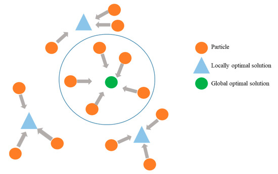 Particle swarm optimization (PSO) algorithm is an optimization algorithm based on population search, inspired by the foraging behavior of birds [14]. When foraging, bird flocks compare their own positions and flight speeds with those of their companions to find the optimal flight route to obtain food [15]. The search principle of the algorithm is illustrated in Figure 1. This algorithm has the advantages of fast convergence speed, few parameters, and easy implementation, allowing it to obtain the optimal solution of the model in a relatively small number of attempts.