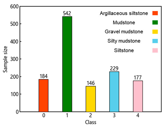 The lithology data for this study were sourced from the cutting logging data of Well DaFeng-1 in the Junggar Basin. The collected lithologies include siltstone, mudstone, conglomerate mudstone, silty mudstone, and sandstone. In addition, eight logging data features, including weight on bit (WOB), revolutions per minute (RPM), input density (ID), input temperature (IT), input conductivity (IC), acoustic travel time (AC), natural gamma (GR), and well diameter (CAL), were collected at depths corresponding to each lithology label. Outliers in some lithology samples were removed using box plots, resulting in a final dataset of 1278 lithology samples. The sample counts for different lithologies are shown in Figure 3. Additionally, 80% of the samples were randomly selected as the training set, while the remaining 20% were used as the test set.