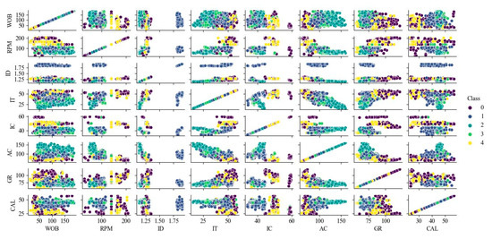The cross-plot method reflects the distribution and morphology of different lithologies in the attribute variable space by intersecting the logging and logging data on a plane and can visually demonstrate the discriminative ability of different attribute combinations in the lithology [20]. The two-dimensional cross-plots of logging and logging parameters are shown in Figure 4. It can be observed that only a few lithologies have clear distinctions in the two-dimensional cross-plots, while most lithologies still exhibit significant overlap. Therefore, traditional methods relying on cross-plots are less efficient in distinguishing different lithologies, and further exploration of the nonlinear relationship between multidimensional features and lithology is needed through machine learning algorithms.