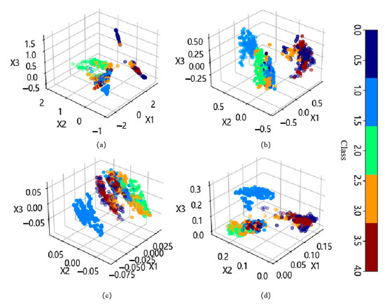 Three-dimensional visualization of the training set after dimensionality reduction. (a) ISOMAP; (b) PCA; (c) ICA; and (d) NMF.