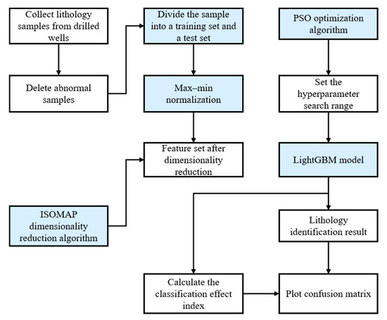 The overall workflow of lithology identification is shown in Figure 6. Firstly, logging and cutting data are collected for different lithologies and corresponding depths. Outliers are removed using data processing techniques such as box plots. The entire dataset is then divided into training and testing data, and the input features are normalized before applying ISOMAP for dimensionality reduction. Finally, the PSO algorithm is used to automatically optimize the hyperparameters of the LGBM model during the training process, and the best lithology identification model is selected based on balanced accuracy.