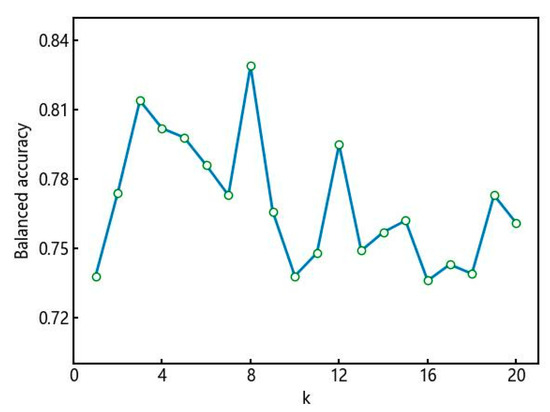 The paper utilized a computer operating system of Windows 10,64-bit, and the development tool used was Python 3.9.7. Since ISOMAP has a parameter k that determines the connectivity among data points, it is important to choose an appropriate value for k. A smaller value of k preserves more local structure but may ignore the global structure, while a larger value of k may introduce noise or unrelated data points into the manifold. This study compared the balanced accuracy of ISOMAP with different values of k within the range of [1, 20]. The balanced accuracy after dimensionality reduction with ISOMAP for different values of k is shown in Figure 7. The highest balanced accuracy is achieved when k = 8 in the ISOMAP algorithm for dimensionality reduction. As the value of k increases further, the balanced accuracy starts to decrease. Therefore, this study set k = 8 as the default parameter for ISOMAP. The optimal hyperparameter combination for the LightGBM model, optimized by the PSO algorithm, is 55, 98, and 0.052 in sequential order.