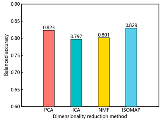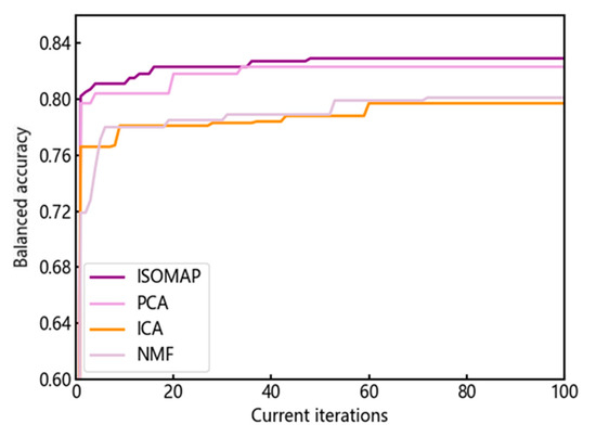 In addition, this study also tested the balanced accuracy results of three other algorithms including the following: PCA, ICA, and NMF. The iterative optimization process and balanced accuracy comparison of the LightGBM models after dimensionality reduction using these four algorithms are shown in Figure 8 and Figure 9. Among them, ISOMAP and PCA achieved higher balanced accuracies, with values of 0.829 and 0.823, respectively. On the other hand, ICA and NMF had lower balanced accuracies, with values of 0.797 and 0.801, respectively. Therefore, in terms of balanced accuracy, the non-linear dimensionality reduction method ISOMAP outperformed the linear dimensionality reduction methods PCA, ICA, and NMF.