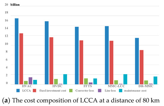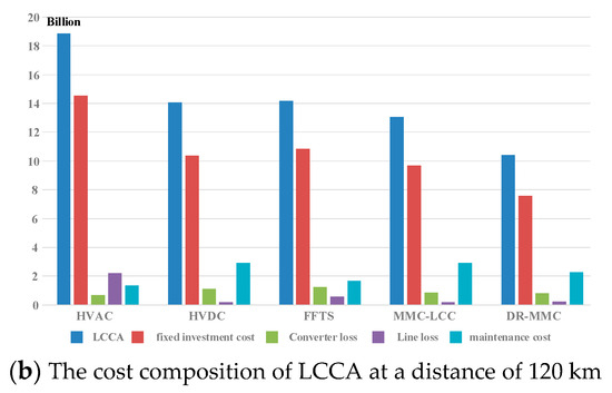 As depicted in Figure 6, HVAC and FFTS stand out regarding maintenance cost advantages over DC power transmission, offering more straightforward and convenient booster station maintenance. Regarding loss costs, which encompass line loss and converter loss, the hierarchy is as follows: HVAC > DR-MMC > MMC-LCC > FFTS > VSC-HVDC. Specifically, in terms of line loss, DC lines incur significantly lower losses than AC lines.