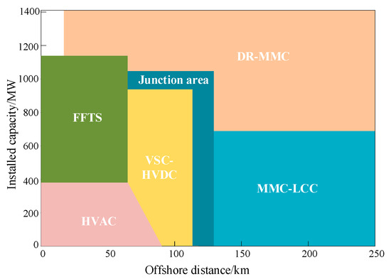 Utilizing the previously mentioned variable parameters of offshore distance and installed capacity, this study defines the operational boundaries of the five proposed types of offshore wind power, as illustrated in Figure 7. HVAC emerges as the economically preferable option within the offshore wind power domain (depicted in pink), where an installed capacity of 200 MW and an offshore distance of 50 km are assumed. Conversely, the FFTS scheme demonstrates superior economic viability for consistent offshore distances in scenarios necessitating high-capacity transmission. In contexts characterized by low capacity and medium to long transmission distances (depicted in yellow), adopting flexible DC transmission emerges as an informed choice from both economic and technical perspectives. Moreover, at transmission distances surpassing 130 km (illustrated in orange and blue), the financial feasibility of DC transmission becomes conspicuous for schemes 4 and 5, particularly with the parallel deployment of DR-MMC technology.