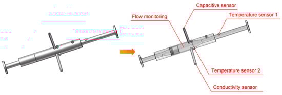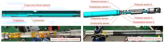 This paper analyses the working principle of the flow monitoring system as well as dissects the key mechanical structure designs, researches the special Venturi structure, and finally determines the new type of intelligent, well-completion downhole flow monitor, i.e., reverse-Venturi, whose design parameters are shown in Table 2. The reverse-Venturi structure is easily lowered into the well workover tool using the channel as a roar channel and machining a flared structure in the side position [26,27]. The production multi-parameter real-time monitoring system selects high-precision pressure and temperature-sensitive components to design the pressure and temperature monitoring system, optimises the design of the Venturi flow detector structure so that it can be installed with different sensors, and combines with the theory of hydrodynamics to realise the monitoring of fluid flow and other parameters in the wellbore [28,29]. The structure of reverse-Venturi combined with sensors is shown in Figure 2.