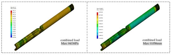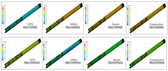 The reverse-Venturi flowmeter needs to be applied in deep/ultra-deepwater wells, which belong to high temperature and high-pressure conditions, and is subjected to tensile and compressive stresses and friction in the process of working, etc. Therefore, it is necessary to check the strength of the Venturi flowmeter under extreme conditions. After research, similar downhole tools use processing and manufacturing of the main material for 42CrMo, the material yield strength of 930 MPa, the tensile strength of 1080 MPa, Poisson’s ratio μ = 0.28 [31]. A single-strength check analysis was carried out with a pressure of 50 MPa, a temperature of 125 °C, and a tensile or compressive force of 650 kN as the simulation boundary conditions. The constraints were fixed constraints applied to the inner end face at the threads of the monitoring system, axial force Fa was loaded through the force, and the radial force was loaded by the pressure due to the contact force of the monitoring system as a homogeneous force to ensure that the stresses were in line with the actual situation. The material and strength calibration boundary conditions are shown in Table 3, and the simulation results of single boundary conditions are shown in Figure 3. Finally, the monitoring silo composite load calibration analysis is carried out, and the results are shown in Figure 4. Based on the given boundary conditions, the simulation results show that the maximum stress is 841 MPa, the temperature and tensile conditions have an equal effect on the stress, the pressure has a smaller effect on the stress, and the results of the strength analysis indicate that there is a certain amount of stress concentration at the threaded connection of the valve body, which is also the maximum equivalent force of the monitoring system.