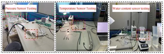 Figure 5 shows the testing process of each sensor and the accuracy of the water content sensor. The temperature and pressure sensors were measured separately, and the capacitance sensor and the capacitance sensor were tested separately and proportioned to the oil–water mixture with different water content. The test results show that the capacitance sensor has a higher accuracy within 50% of the water content, with an error of less than 2%, and the conductivity sensor has a higher accuracy above 50% of the water content. At the same time, the temperature sensor was put into the constant temperature box for accuracy testing, and the pressure sensor was tested by pumping. Table 4 shows the test results. The measurement of each sensor is stable, and the accuracy is high.