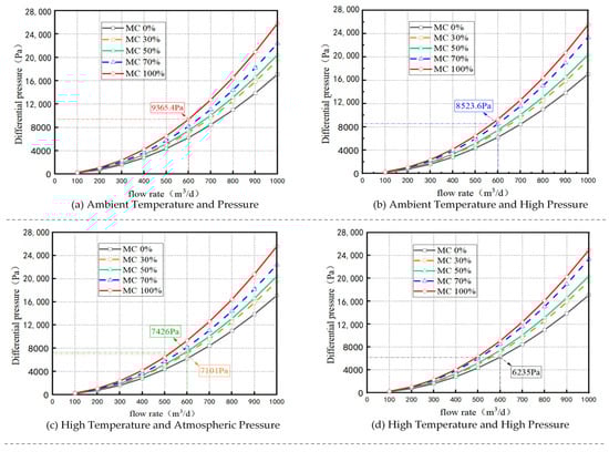 According to the simulation results, the differential pressure of the reverse Venturi under four working conditions with different water content is plotted on the curve to observe the degree of influence on the flow monitoring of the reverse Venturi under different working conditions, and the results of the simulation under the working conditions are shown in Figure 8. The simulation results show that the pressure drop curves of the reverse-Venturi at different water contents under the four operating conditions converge. Under the right-angle coordinate system, the relationship between the pressure difference between the inlet and throat of the reverse Venturi and the flow rate of the mixed fluid shows a parabolic relationship; the smaller the viscosity of the mixed fluid, the smaller the friction loss in the flow process, and the larger the pressure difference. The flow rate is proportional to the differential pressure; when the flow rate is certain, the higher the water content, the higher the differential pressure; when the water content is certain, the higher the flow rate, the higher the differential pressure, which is in line with the law of fluid flow in the Venturi, and verifies the reliability of its structural design.