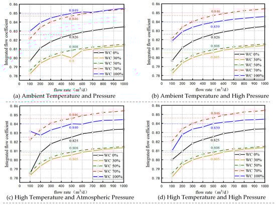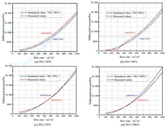 Under the conditions of normal temperature and pressure, different water content, the results of numerical simulation and experimental test results are compared in terms of differential pressure and integrated flow coefficients and other aspects of the comparative analysis; the two verify each other to check whether the flow monitoring design meets the requirements, the results of the experiment are shown in Figure 13. The comparison results show that under the conditions of normal temperature and pressure and different water content (0–100%), the numerical simulation test results are basically the same as the experimental test results. Both test results show that the flow rate and differential pressure are proportional to the flow rate; when the flow rate is certain, the higher the water content, the greater the differential pressure, in line with the law of the Venturi flow monitoring, indicating that the reverse-Venturi flowmeter structure design to meet the requirements.