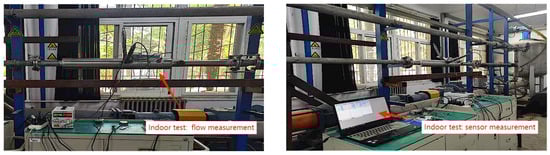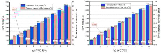 According to the optimised structural design of the reverse-Venturi flowmeter prototype and indoor experimental testing, the reverse-Venturi structure is shown in Figure 10; the experimental process is shown in Figure 11. The development of indoor experimental testing programme for reverse-Venturi flow monitoring under normal temperature and pressure conditions, carried out 10 types of displacements (100–1000 m3/d), 8 water content (0%, 30%, 40%, 50%, 60%, 70%, 80%, and 100%), indoor experimental testing, 70%, 40%, 50%, 60%, 70%, 80%, and 100%) of the reverse-Venturi fluid flow indoor experimental test, the experimental results are shown in Figure 12. The experimental results show that the flow rate in the 100 m3/d~200 m3/d error range was within 30%; the flow rate in the 200 m3/d~400 m3/d measurement accuracy error range was within 20%, the flow rate in the 400 m3/d~1000 m3/d measurement was highly precise with an error range within 5%. Due to this experimental device being mostly for large-displacement experiments, the flow rate is low in the pipeline fluid flow is less, resulting in a small-displacement measurement error of 20–30%; the subsequent experimental device will be replaced for small-displacement secondary experiments. The experimental test flow measurement range of the maximum flow rate and minimum flow rate ratio of 2.5 in the Venturi flow within the effective range ratio to meet the design requirements.