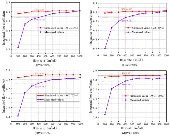 A comparison of numerical simulation and experimental results in terms of integrated flow coefficient shows that under different water content, the integrated flow coefficient of the inverted Venturi shows a slight increase with the increase in flow rate. When the flow rate is 100–200 m3/d, the deviation between the experimental value and the numerical simulation value of the integrated flow coefficient is large; when the flow rate is 200–400 m3/d, the deviation between the experimental value and the numerical simulation value of the integrated flow coefficient decreases, and the range of error is more than 15%. The reason for the error of more than 15% at small displacements is consistent with the flow monitoring; when the flow rate is low, the fluid in the experimental setup is not enough to meet the operation of the whole experimental setup, for which a secondary experiment with small displacements will be carried out subsequently. When the flow rate is 400–1000 m3/d, the simulation value is stable between 0.80–0.86, the experimental value is stable between 0.75–0.86, and the experimental value is stable between 0.75–0.86. Between the flow rate of 400–1000 m3/d, the simulated value is stable between 0.75–0.815, the numerical simulation and experimental results fit well, and the error range is within 10%, which verifies the stability of its structural design. Figure 14 shows the comparison results.