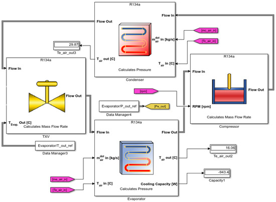 Figure 1 shows the Matlab-Simulink model implemented for a VCRS. The implemented system has the option of varying the compressor speed and the opening of the electronic expansion valve (EEV). The aim of being able to have these two actions in the system is to perform an analysis of parameters as a function of these two variables. Table 1 shows the system and material characteristics of the complete VCRS components. The analysis was performed for four heat loads, for a compressor speed range 1000–3000 rpm and the valve actuation was based on the percentage of valve opening, i.e., 0.035–0.15%. The ranges of the performance variables are those allowed by the dimensions of the VCRS.