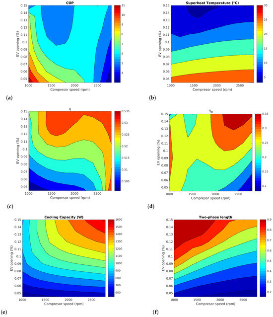 The influence of compressor speed and EEV opening on the cooling capacity is shown in Figure 2e). It should be noted that the maximum cooling capacity zone coincides with the operating conditions of the zone of greatest second-law efficiency. This contour map provides additional information since it can be seen the possibility to keep the compressor speed and only change the EEV opening to increase the cooling capacity and viceversa. Figure 2f) is the contour plot of the two-phase length in the evaporator coil. The maximum two-phase length is achieved at compressor speed lower than 2000 rpm but at valve opening larger than 0.11% stroke. As can be observed, it is possible to change significantly the two-phase length by varying the compressor speed and EEV opening, showing that this variable could be used as a control parameter to bring the system to the high-efficiency operating zones shown in Figure 2c,d.