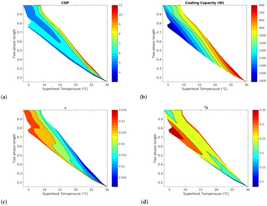 In Figure 3d, the second-law efficiency contour map is plotted as a function of control parameters. As for the cooling capacity, these results clearly show that excessive two-phase length in the evaporator can have unfavorable effects on the exergy, collapsing second-law efficiency values in a smaller area, in contrast with first-law efficiency.