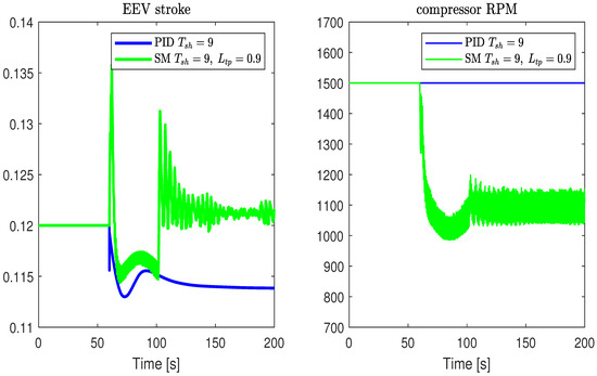 As a first test, a PID controller that uses EEV stroke to control while preserving a constant compressor velocity is compared against the proposed sliding mode controller which considers compressor velocity as control input and two-phase length as controlled output. The results are shown in Figure 4 and Figure 5. The desired superheat temperature is while for the sliding mode controller, there is also a desired two-phase length corresponding to a . Due to large overshoot when introducing a large step change on superheat temperature, this step is smoothed by a first-order filter with time constant of 10 s. From Figure 4, it is clear that when controlling both, superheat temperature and two-phase length, a reduction in compressor velocity is achieved while maintaining the superheat temperature, see Figure 5.