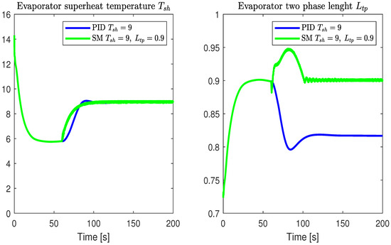 In Figure 7, there is a reduction in two-phase length from 0.9 to 0.82 without change in . As a consequence, the cooling capacity is increased. Note that the controller increases the compressor velocity. That behavior illustrates the complexity of the interactions in the system since for the same a larger does not necessarily lead to a larger cooling capacity.